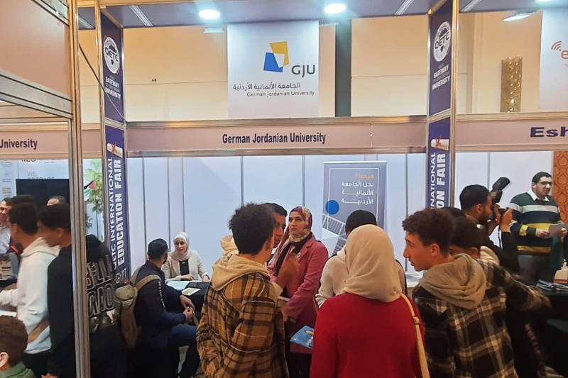 ومثل الجامعة في المعرض نائب عميد الدراسات العليا الدكتور لؤي بني اسماعيل ومن دائرة القبول والتسجيل السيدة براء العجارمة حيث تم تعريف الزوار بنشأة الجامعة وبرامجها الأكاديمية وبرنامج الدراسات الثنائية وكيفية التسجيل فيها وعلاقات الشراكة مع الجامعات والمصانع الألمانية الشريكة التي تستقبل الطلبة في السنة الدراسية الرابعة.