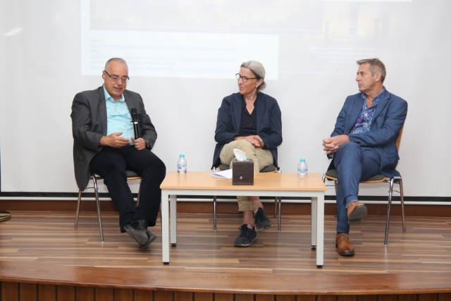 The panel was headed by Professor Nizar Abu-Jaber, director of the Center for the Study of Natural and Cultural Heritage at GJU. Participating were professors Iain Stewart of the Royal Scientific Society and Claudia Buehrig of the German Archaeological Institute (DAI). Professor Abu-Jaber gave a brief overview of the purpose of the panel and introduced the guests. Professor Stewart gave a presentation about geoparks and their role in both preserving important geological sites as well as fostering development of local communities. Professor Buehrig spoke about her project in Um Qais (north Jordan) involving the revival of local stone masonry traditions through expertise exchange with Germany.