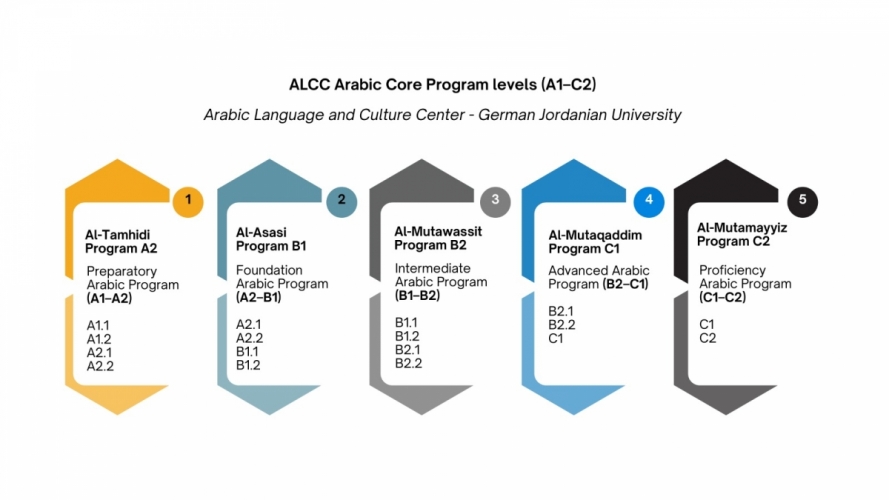 The Arabic Core Program is the main academic track offered by the Arabic Language and Culture Center (ALCC) at the German Jordanian University (GJU). The program is designed to guide learners through a structured progression that integrates Modern Standard Arabic (MSA) and Jordanian/Levantine Colloquial Arabic, following international proficiency standards set by the Common European Framework of Reference for Languages (CEFR) and the American Council on the Teaching of Foreign Languages (ACTFL).