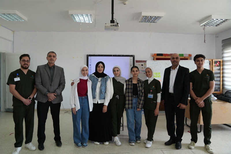 The school principal, Ms. Hala Takhaina, warmly welcomed the delegation from SN, which included the Vice Dean of SN, Dr. Mohammad Al-Zaatreh, and Dr. Mohammad Al-Saadi, alongside a group of nursing students: Abdulrahman Heshmeh, Ammar Al-Asouli, Marah Al-Shawabkeh, and Rama Al-Nawafleh.
