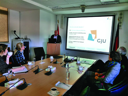 Dr. Yasser Rajjal, Assistant to the President for Communications and Public Relations, gave a brief overview about GJU, the establishment, achievements, and challenges; also he demonstrated several features, which made GJU a unique model in transnational education.