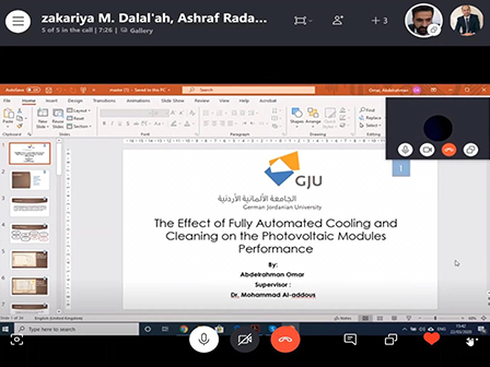 The School of Natural Resources Engineering and Management (SNREM) at the German Jordanian University (GJU) conducted two discussions for a master thesis remotely, on 22/3/2020.The first Master thesis for student Abdelrahman Basim Omar entitled “The Effect of Fully Automated Cooling and Cleaning on the Photovoltaic Modules Performance”, was supervised by Dr. Mohammad Al-Addous. The defense committee consisted of Dr. Mohammad Al-Addous, Dr. Zakariya Dalalah, Dr. Madhar Bdour from GJU, and Dr. Ashraf Radideh from Yarmouk University.