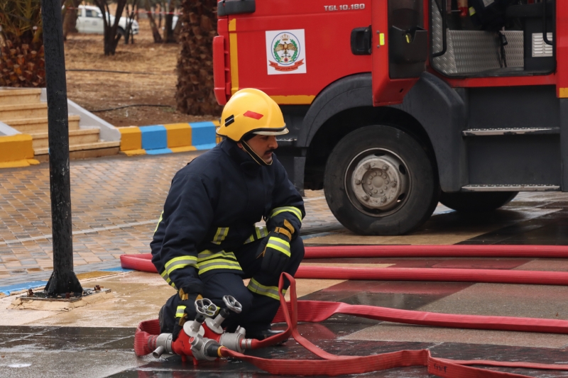 The German Jordanian University (GJU), in collaboration with the Madaba Directorate of Civil Defense, organized a practical training exercise to simulate a fake fire at the university. The event was attended by Prof. Ala’aldeen Al-Halhouli, the President of the German Jordanian University, and Brigadier General Raafat Al-Maaytah, the Director of Madaba Police Directorate.