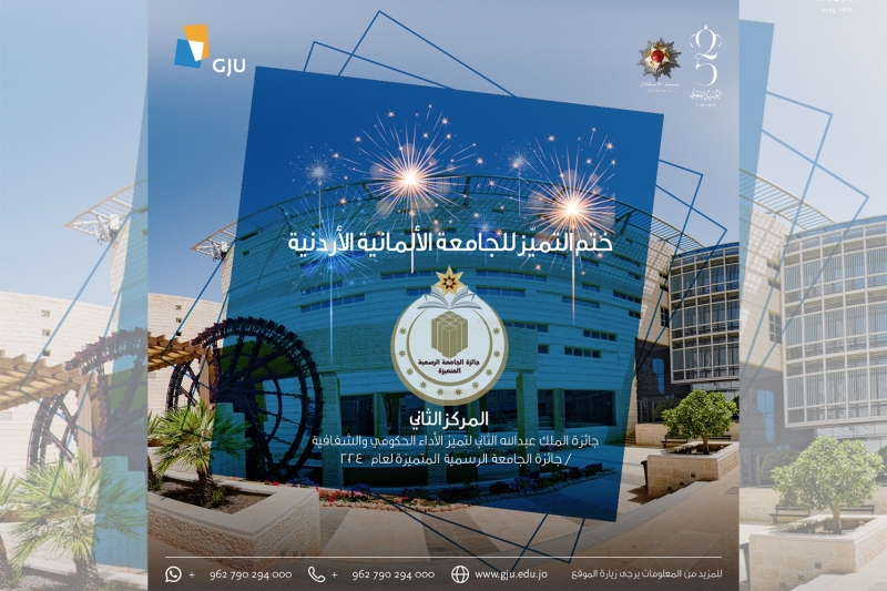 The German Jordanian University (GJU) has achieved a significant milestone in enhancing its academic and research reputation at the national level. The university has been awarded the Seal of Excellence and secured second place in the Official Distinguished University Award for 2024, part of the King Abdullah II Awards for Excellence in Government Performance and Transparency.
