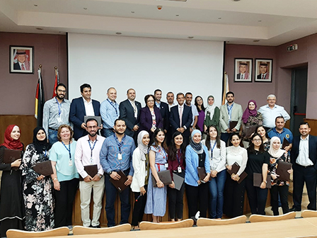 On Thursday, July 25, 2019, the Accreditation and Quality Assurance Department at the German Jordanian University (GJU) in cooperation with the Human Resources Department and the Consulting and Training Center celebrated the graduation in a group of university employees who completed the “ISO 9001: 2015- QMS Lead Implementer Training Course”, in the presence of the President of GJU Prof. Manar Fayyad and a number of faculty members and administrative.