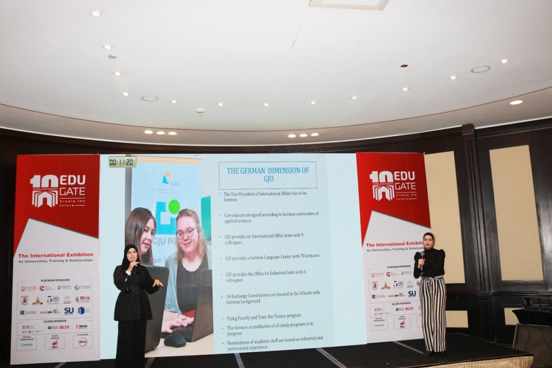 A delegation consisting of Haneen Sobhi and Rawan Al-Haj Ahmad from the Admission and Registration Department at the German Jordanian University (GJU) participated in the 12th International Education Exhibition 2023, which was organized by Expert Education Services in Cairo.