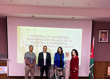 Students, Dana Koreek, Rama Alghzawi and Shatha Khrewesh, from the School of Natural Resources Engineering and Management (SNREM), at the German Jordanian University (GJU) discussed the graduation project titled "Converting Shawarma and Falafel Oil into biodiesel" under the supervision of the Head of the Department of Energy Engineering, Dr. Mustafa Jaradat.