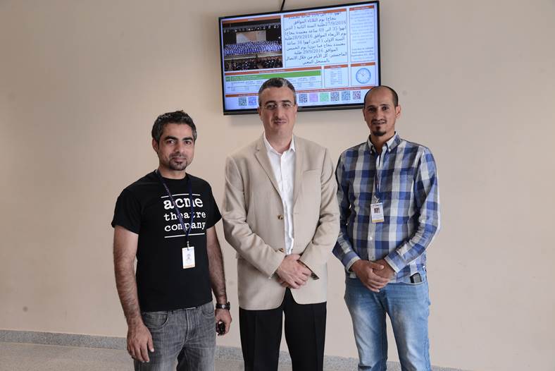 The Information Systems and Technology Center (ISTC) team developed an Information Display System (IDS) in-house to display announcements, school news, images, and other information on TV screens that are mounted in lobbies, squares, hallways, and cafeterias in the university. The GJU Intranet infrastructure (including firewalls, links, and switches) is utilized to secure and transmit the displayed content from a web application on a server in the data center to the web browsers on the Raspberry Pi devices that are connected to the screens. The development team at the center implemented the dynamic web page (i.e., dynamic web application) that is displayed on the screens and the content management application that is used by administrators to manage the dynamic content on that page. Moreover, users may interactively scan QR code images displayed on the screens using any QR code reader that is installed on their smartphones to easily access common websites and GJU Wi-Fi without the need to remember their corresponding URLs or credentials.
