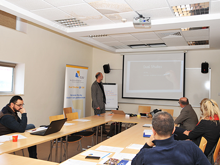 On Tuesday 26th of March an information session about the major impacts of cooperative educational concepts on curriculum design took place at the German Jordanian University (GJU). Deans and representatives of the Schools for Applied Technical and Medical Sciences and the School for Management and Logistic Sciences joined the workshop facilitated by the Dual Studies Advisor Stefan Braun.