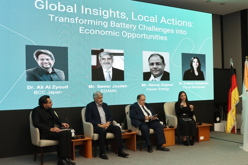 The event also featured a panel discussion titled "Global Insights and Local Actions: Turning Battery Challenges into Economic Opportunities," moderated by Dr. Fadwa Dababneh. The session included participants such as Mr. Samer Joudeh, Eng. Hanna Zghoul, and Dr. Ali Al-Zyoud, who discussed various topics related to battery repurposing, integrating batteries into energy systems, and the economic feasibility of establishing a circular economy for batteries.