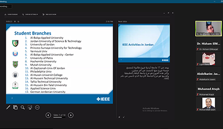 Dr. Ala’ Khalifeh, an associate professor in the school of electrical engineering and information technology in GJU, who is also the chairman of IEEE Jordan section kicked off the webinar by talking about IEEE in Jordan, Jordan section officers and executive committee members, IEEE Jordan section statistics and activities.