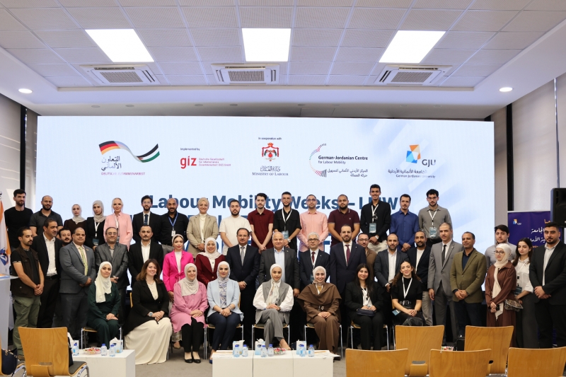 During the launch of the “Mobility for Work Week: International Career Gateway,” organized by the Mobility for Work Center at the German Jordanian University in cooperation with the German Agency for International Cooperation (GIZ) and the Jordanian Ministry of Labor, under the Migration and Development Centers project funded by the German Federal Ministry for Economic Cooperation and Development, he pointed out that one of the main challenges in today’s labor market is the shift to different forms of flexible work—especially in artificial intelligence, data processing, information technology, and cybersecurity. He noted that failure to adapt to these changes would leave us isolated from global market requirements.