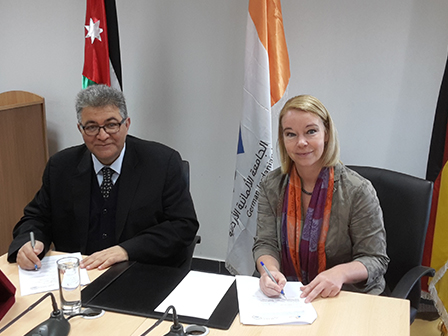 On Thursday 8th of March 2018, The German Jordanian University (GJU) represented by Vice President Prof. Dorit Schumann signed a Memorandum of Understanding (MoU), with AL- Quds University (AQU) represented by President Prof. Imad Abu Kishek to promote and extend cooperation and understanding, to establish scientific and educational cooperation.