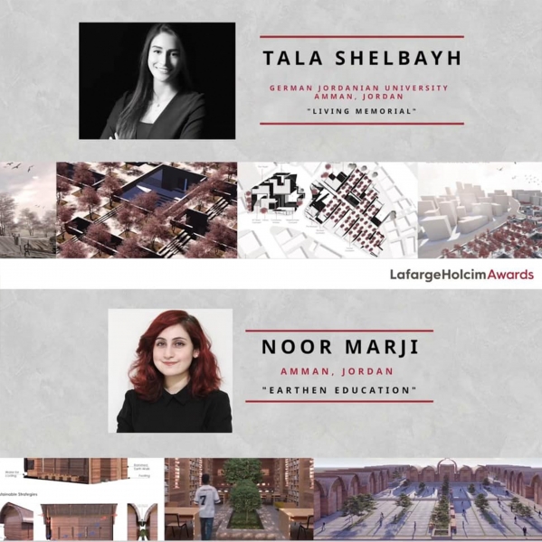 Graduates of the School of Architecture and Built Environment (SABE) at the German Jordanian University (GJU), Tala Shelbayh and Nour Marji, won second and fourth places in LafargeHolcim competition 2020 - the next generation category for the Middle East Africa region. Shelbaya's graduation project won second place under Arch. Tha’er Qub’a supervision, while Marji's won fourth place for the second time!