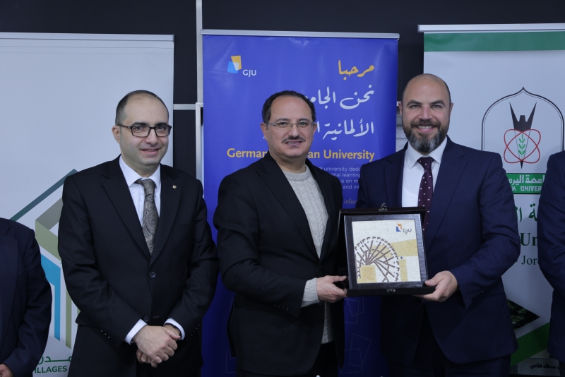 The MoU was signed by the President of the German Jordanian University, Prof. Ala’aldeen Al-Halhouli; the President of Yarmouk University, Prof. Malek A. Alsharaari; and the Director General of the Cities and Villages Development Bank, Dr. Wasim Al-Haddad.