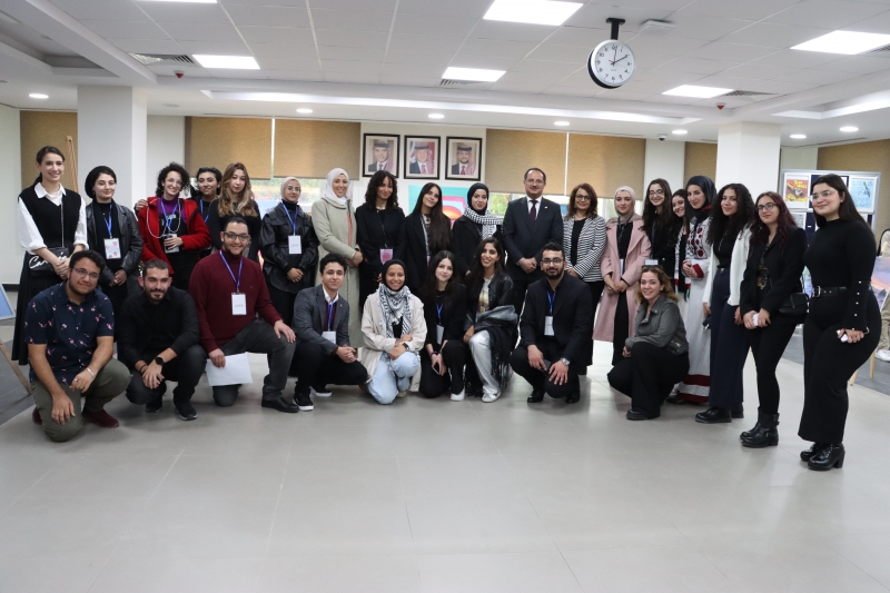 The Deanship of Student Affairs (DSA) at GJU, through the Arts Club, organized an art exhibition of students' talents and designs, in the presence of the President of GJU, Prof. Ala’aldeen Al-Halhouli, Vice President Prof. Malek Alsharairi, Dean of Student Affairs, Dr. Thelal Oweis, GJU’s students and the supporting entities.